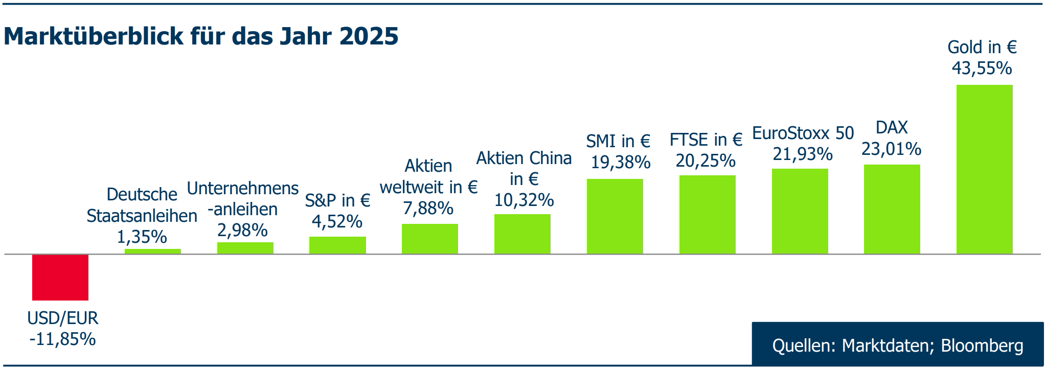 Schauen wir auf das Jahr 2025 zurück, so können wir von einem besonderen Börsenjahr sprechen. Zu Beginn hatten wir eine vorsichtige Haltung zu den Märkten (Thema: Jahr des Kapitalerhalts), welche sich Anfang April mit dem von Donald Trump ausgerufenen „Liberation Day“ und massiv nachgebenden Märkten auch zu bestätigen schien. Umso überraschender war die darauffolgende starke Aktienmarkt-Rally, welche Anpassungen der Gewichtungen und in der Betrachtung der Märkte erforderte. Vor allem neue Anlegergruppen in den USA (Privatanleger, die über ein Drittel des Handelsvolumens ausmachten) sorgten für steigende Märkte und eine Börsendynamik, die so viele nicht für möglich gehalten hatten. Geopolitische Konflikte, eine starke Hand der US-Administration, deren Einfluss zu jederzeit an den Märkten allgegenwärtig war und eine FED, die die Zinsen sukzessive weiter lockerte, waren neben der Künstlichen Intelligenz (KI) treibende Kräfte in diesem Jahr. Hinzu bekam das globale Phänomen der fiskal- und industriepolitischen Aktivität eine wichtige Rolle, besonders in den USA und Deutschland. In diesem Umfeld trugen Flexibilität sowie Offenheit für alternative Szenarien und veränderte Sichtweisen auf die Märkte inklusive eines soliden Risikomanagements zum Erfolg einer jeden Anlagestrategie bei. Europäische Aktienindizes erreichten teils zweistellige Ergebnisse, während sich die gute Entwicklung der US-Indizes durch einen um ca. 12% abwertenden US-Dollar für Euro-Anleger im teils mageren einstelligen %-Bereich bewegte. Die Streuung der Renditen zwischen einzelnen Branchen, aber auch zwischen Growth- und Value-Titeln war im Jahr 2025 außergewöhnlich. Bei Anleihen konnten im